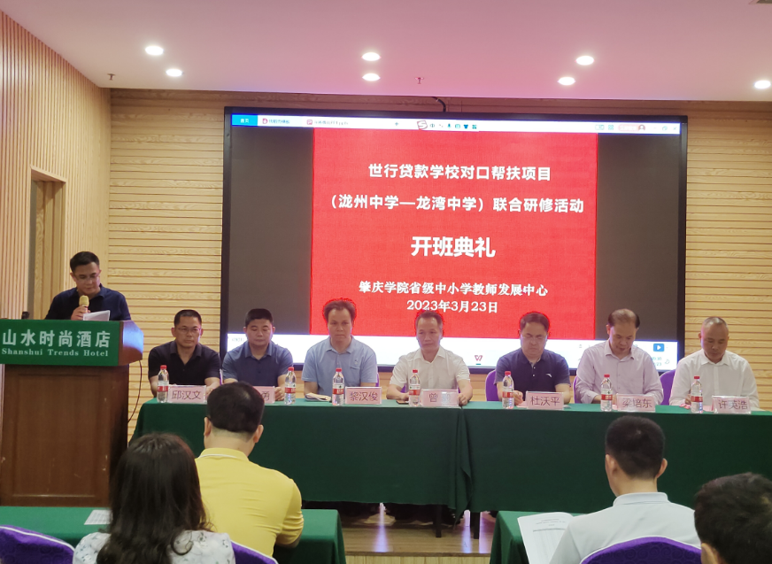 3月23日下午,省教育厅世行贷款公司对口帮扶项目(泷州中学-龙湾中学) 联合研修班在肇庆山水酒店7楼会议室如期举行开班典礼。304永利集团登录入口副经理曾毅教授、罗定市教师发展中心教研部黎汉俊主任、泷州中学及龙湾中公司领导与老师出席了开班仪式。