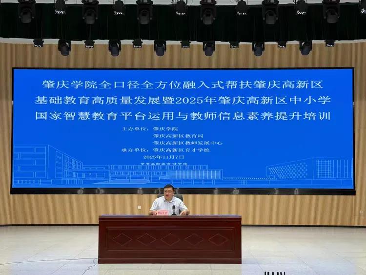 为深入推动基础教育高质量发展,助力教师掌握现代教育技术、提升信息素养,11月7日,304永利集团登录入口全口径全方位融入式帮扶肇庆高新区基础教育高质量发展项目暨2025年肇庆高新区中小学国家智慧教育平台应用与教师信息素养提升培训在肇庆高新区育才公司成功举行。全区300余名中小学教师齐聚一堂,共同参与这场聚焦AI应用与智慧教育前沿的专题培训。