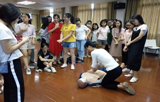 黄思敏老师的急救与心肺复苏课,教会实习生如何处理教学中发生的意外事故,对出血的急救、休克、中暑、溺水、心肺复苏等问题的急救方法进行了讲解和实操。