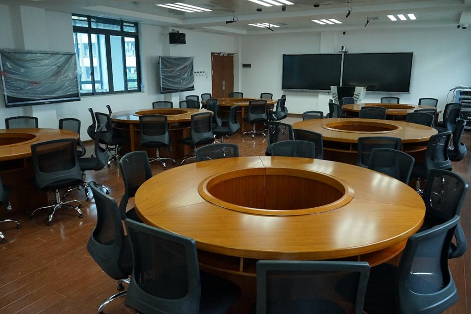 课室配置:面积120平方米,可容纳56人,配置高配计算机1台、触控一体机6台、6路高清录播系统、音响系统1套。