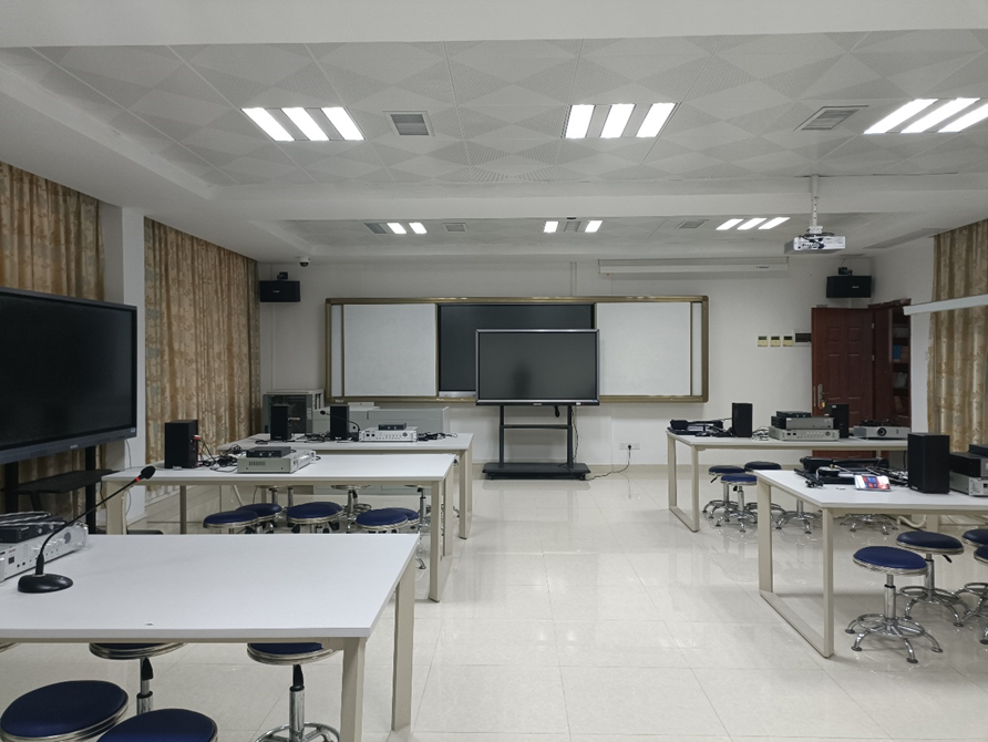 课室配置:面积78平方米,可容纳40人,配有教师电脑、多媒体试验台、电子交互白板、分组讨论屏幕,有固定式白板。