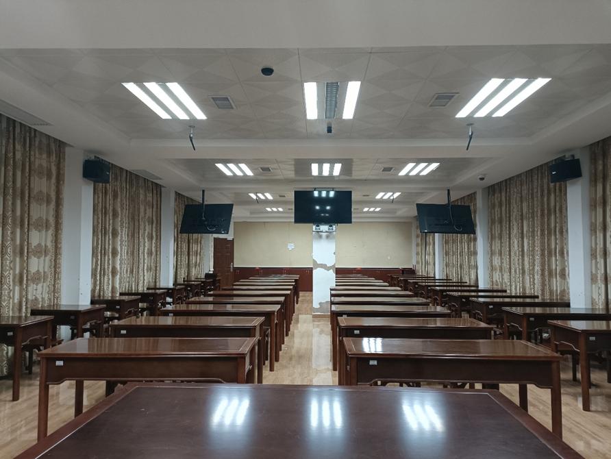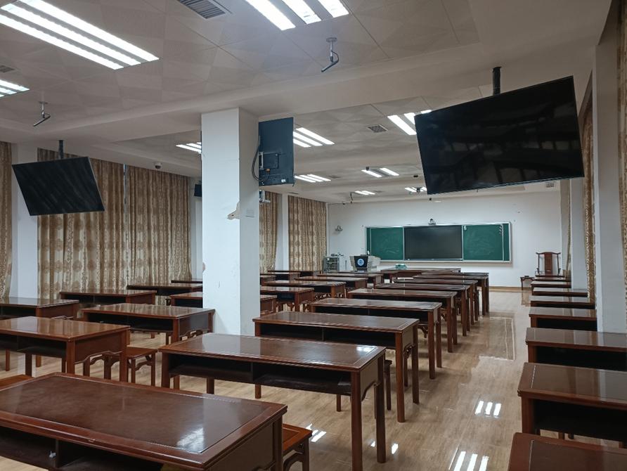 课室配置:面积150平方米,可容纳75人,配有书法桌椅、教师电脑、电子交互白板、5机位录播系统,有推拉式黑板。