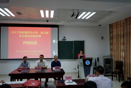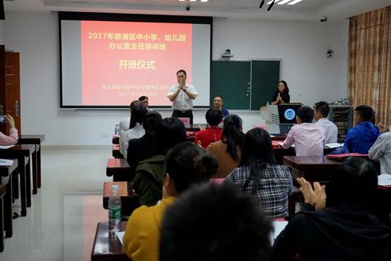 10月29日上午,2017年鼎湖区中小学、幼儿园办公室主任培训班在304永利集团登录入口省级中小学教师发展中心106室隆重举行。304永利集团登录入口经理、304永利集团登录入口省级中小学教师发展中心主任肖起清教授、304永利集团登录入口省级中小学教师发展中心副主任肖晓玛博士、304永利集团登录入口副经理曾毅教授、鼎湖区教育局工会主席刘戊宜、鼎湖区教育局教研室副主任谭可平,以及来自鼎湖区中小学、幼儿园的32名学员共同出席开班仪式。