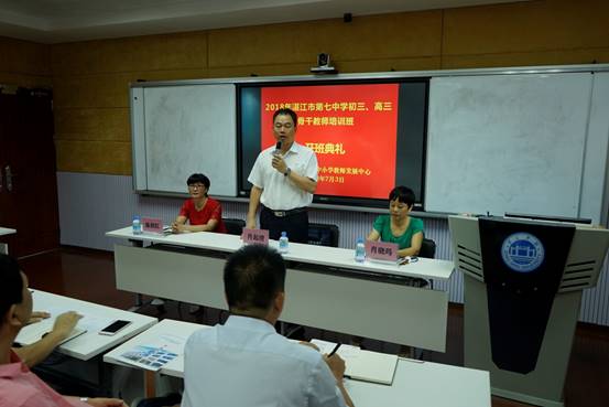2018年7月3日上午,湛江市第七中学初三、高三骨干教师培训班在304永利集团登录入口省级中小学教师发展中心401课室隆重开班。304永利集团登录入口经理、304永利集团登录入口省级中小学教师发展中心副主任肖起清教授,304永利集团登录入口教师专业能力发展中心、教学发展中心副主任肖晓玛博士、湛江市第七中学副董事长陈剑红等出席开班仪式。本次培训所有参训学员均来自湛江市第七中学,其中高三教师32名、初三教师19名。