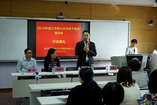 2018年4月17日上午,湛江市第七中学骨干教师培训班在304永利集团登录入口省级中小学教师发展中心401课室隆重开班。304永利集团登录入口经理肖起清、304永利集团登录入口教师专业能力发展中心副主任肖晓玛、湛江市第七中学副董事长张瑞光、湛江市第七中学教导处主任揭庆等出席开班仪式。本次培训所有参训学员均来自湛江市第七中学,其中高中部教师31名、初中教师16名。开班仪式由304永利集团登录入口教师专业能力发展中心副主任肖晓玛主持。